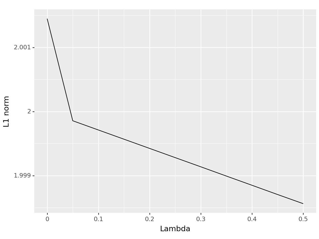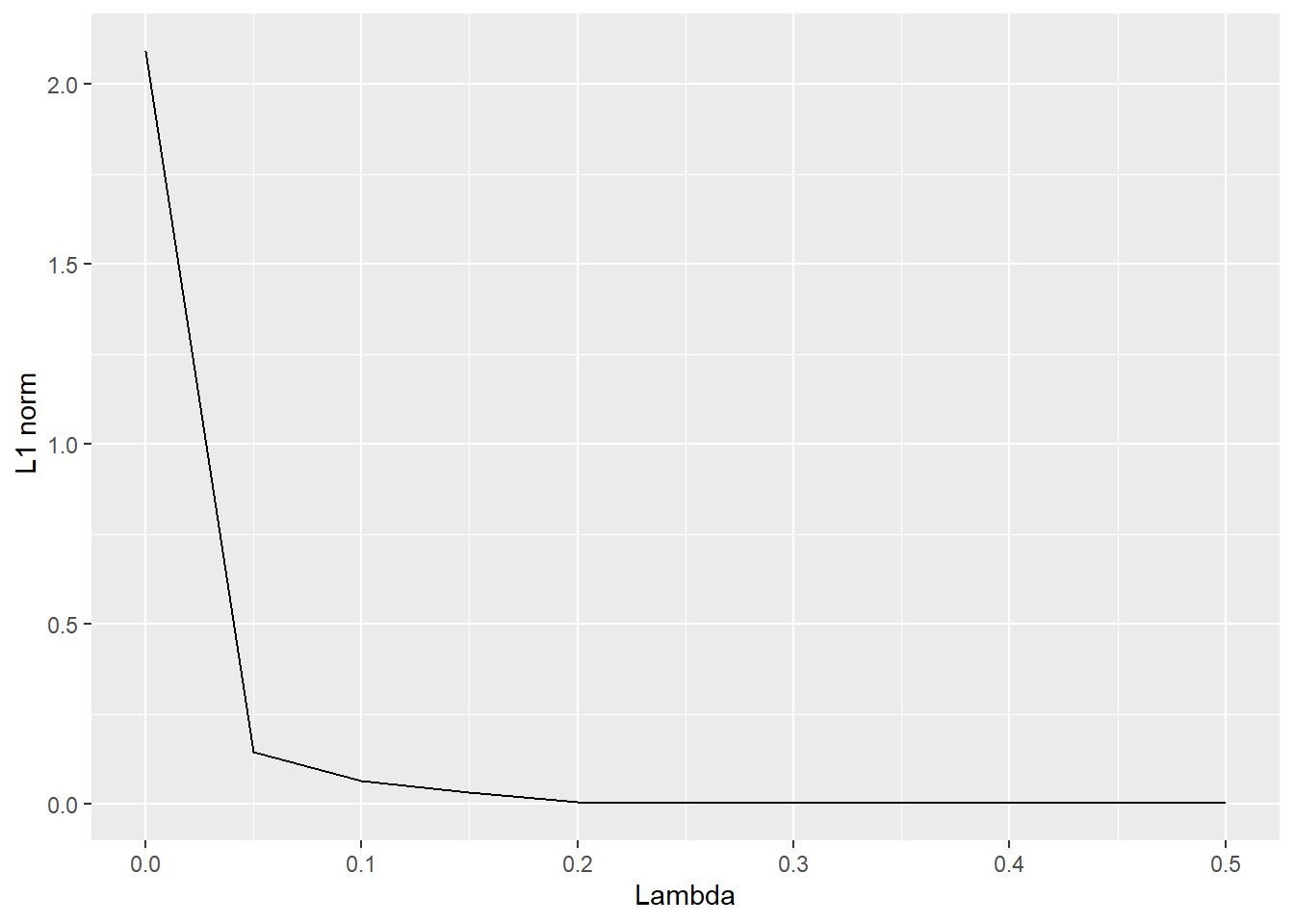 Finally, as in the previous example with Ridge regression, I illustrate how a larger penalization term \(\lambda\) affects the \(L_1\) norm of the regression coefficients.