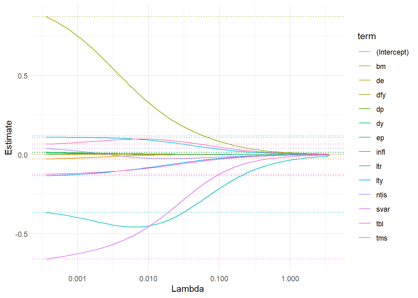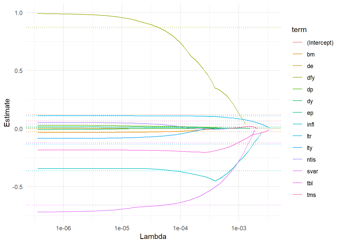 While the code above should work, there are well-tested R packages available that provide a much more reliable and faster implementation. Thus, you can safely use the package glmnet. As a first step, the following code create the sequence of regressions coefficients for the Goyal-Welch dataset which should be identical to the example we discussed in the lecture slides.