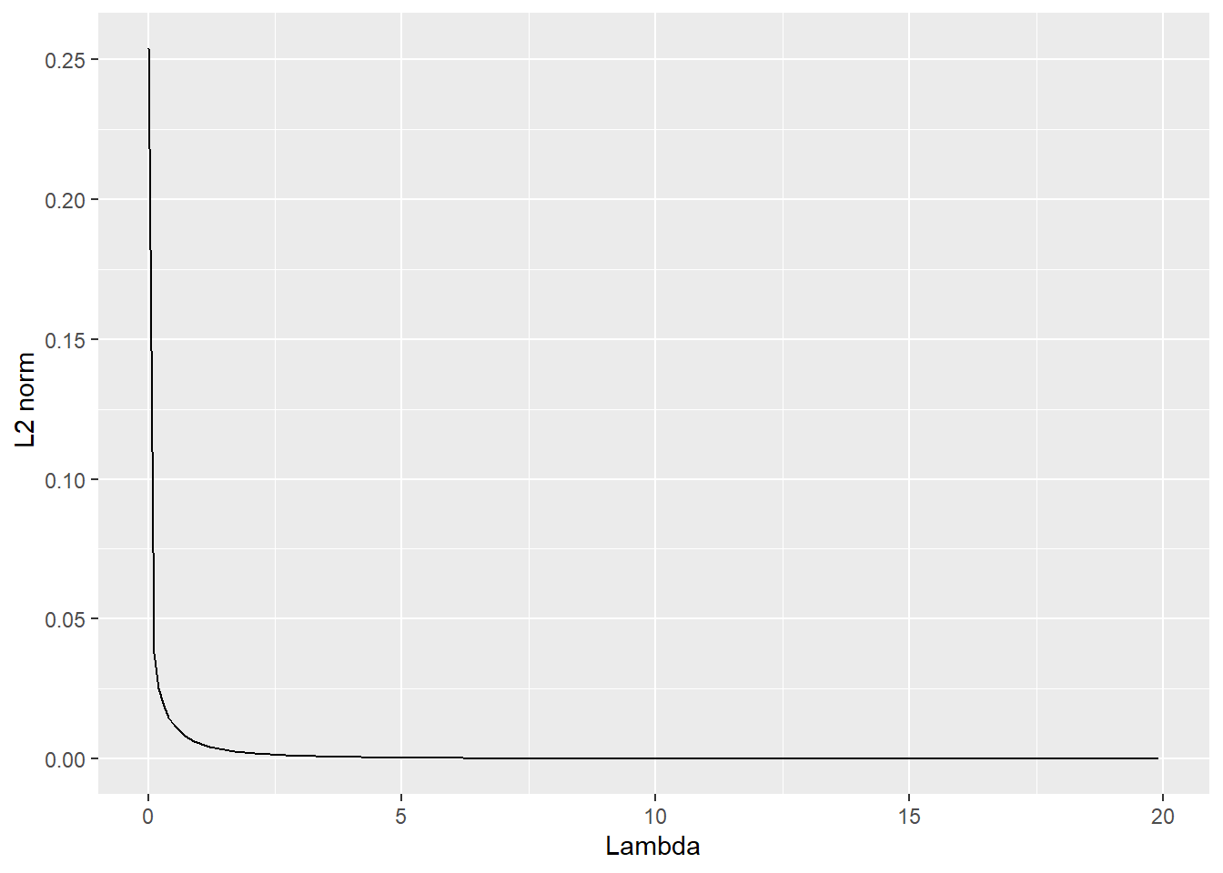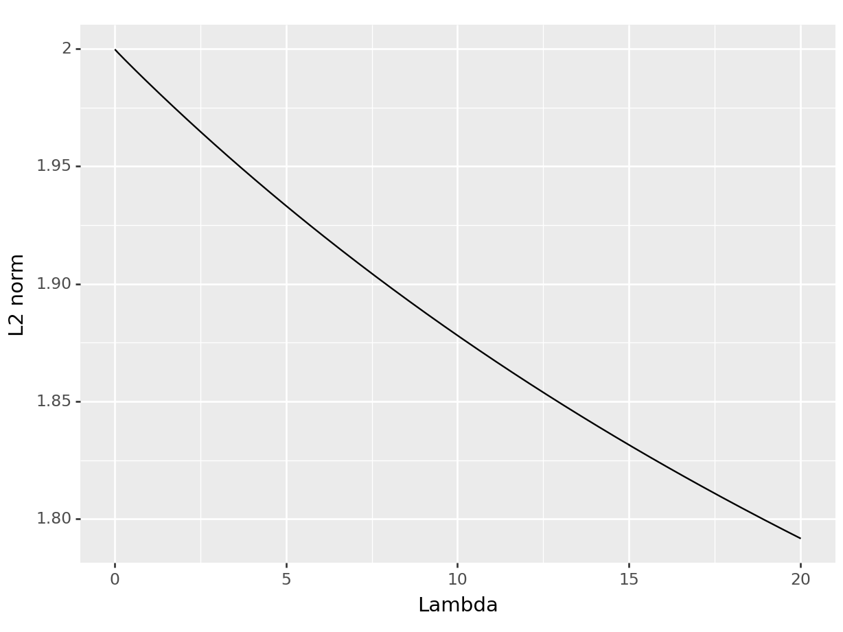 l2_norm <-function(lambda) sum(ridge_regression(y = y, X = X, lambda = lambda)^2) # small helper function to extract the L_2 norm of the ridge regression coefficientsl2_norm <-Vectorize(l2_norm) # To use the function within a `mutate` operation, it needs to be vectorizedseq(from =0.01, to =20, by =0.1) |>as_tibble() |>mutate(norm =l2_norm(value)) |>ggplot(aes(x = value, y = norm)) +geom_line() +labs(x ="Lambda", y =" L2 norm")